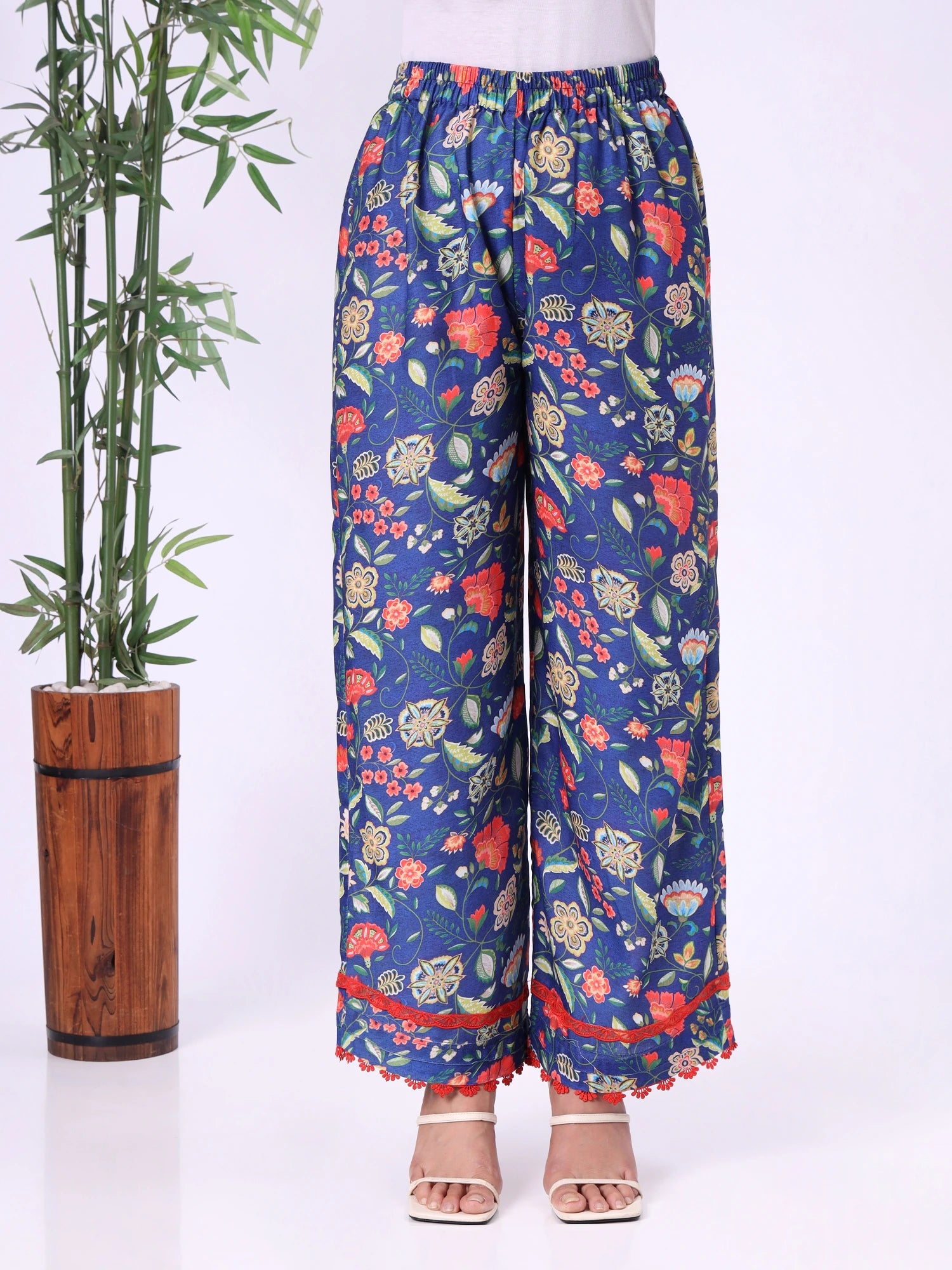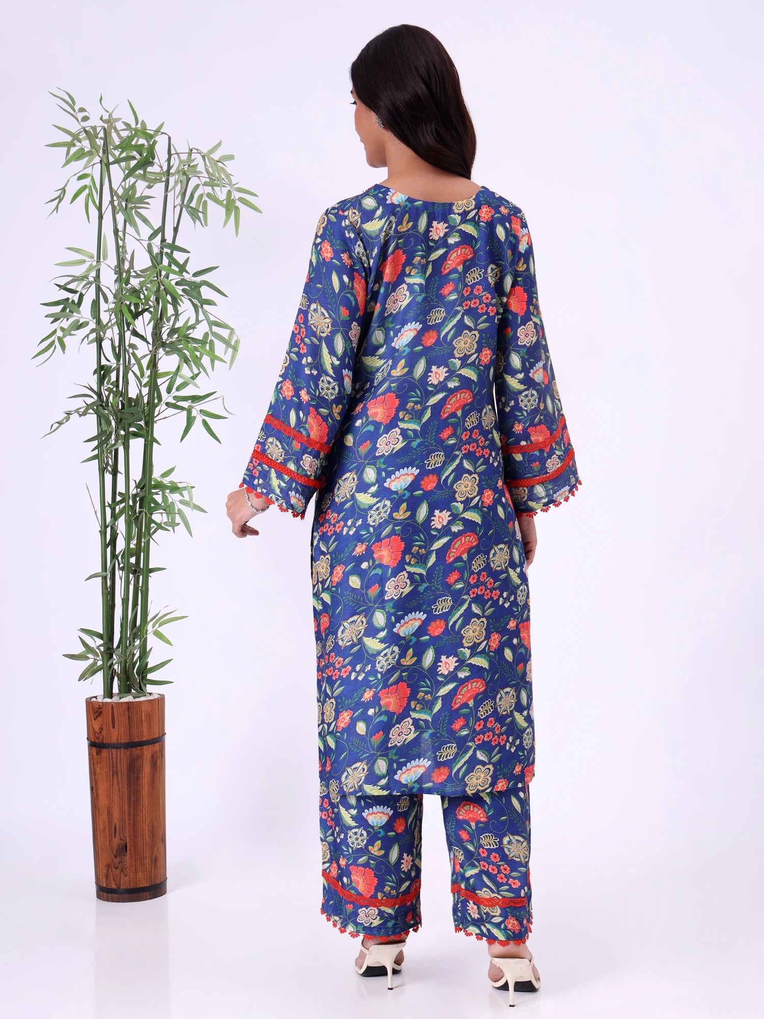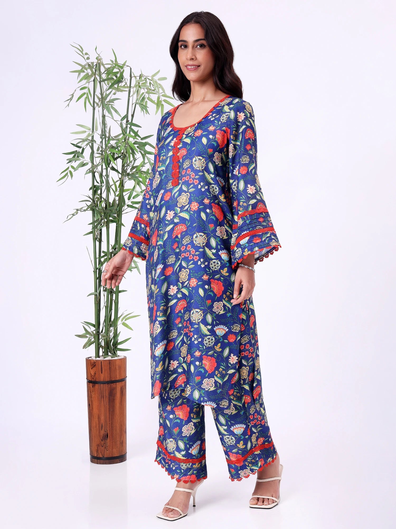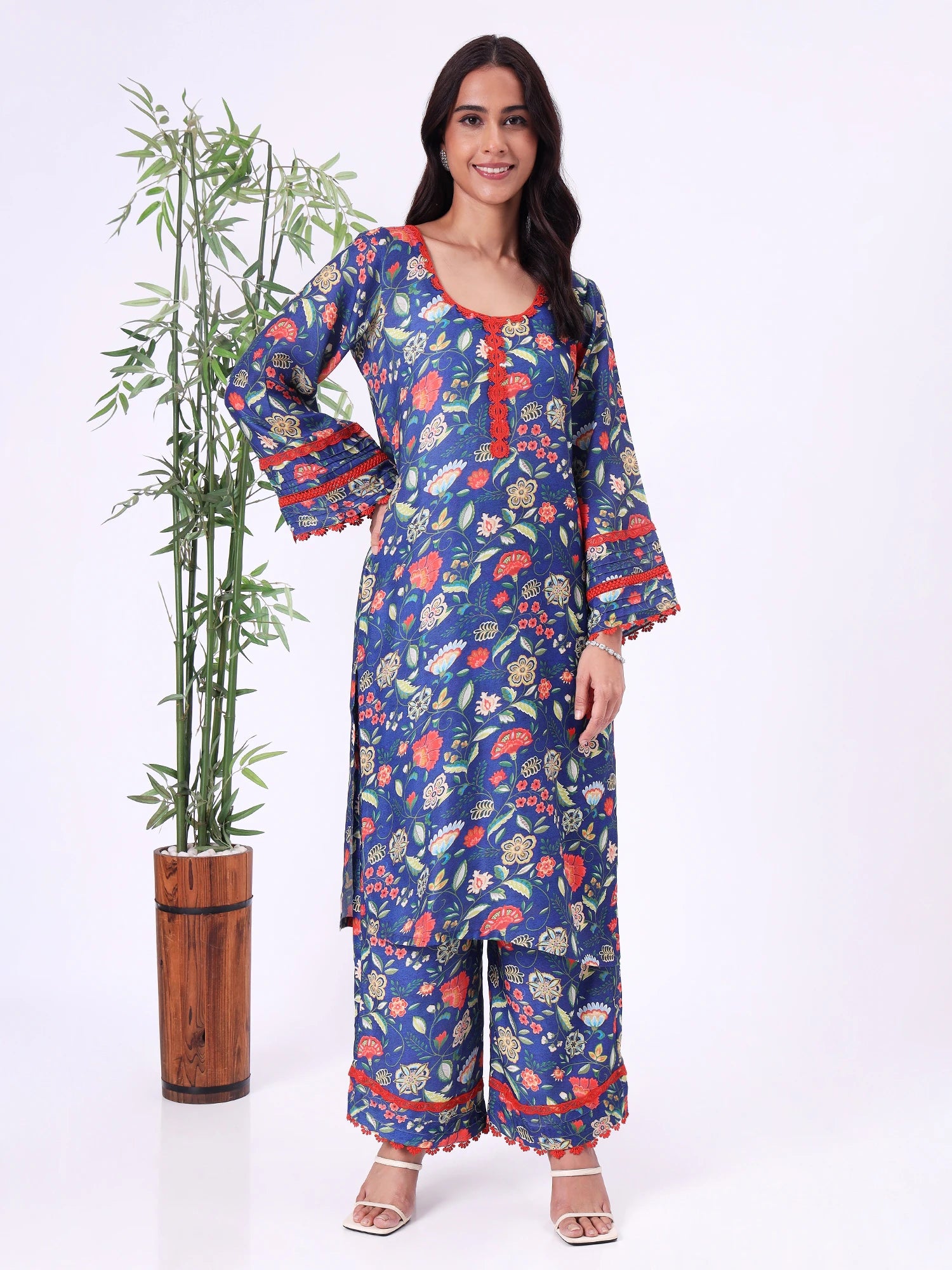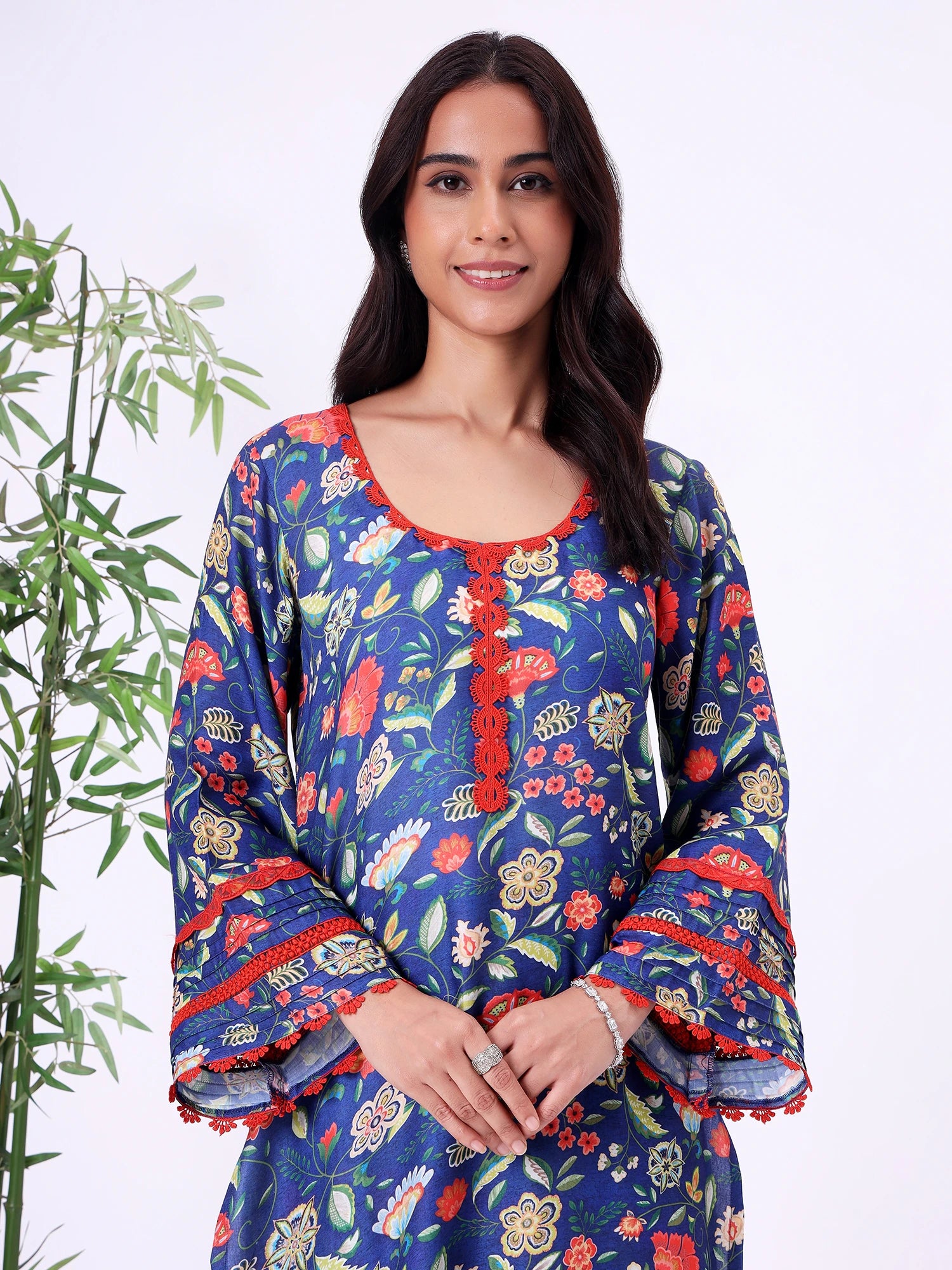 Blue floral kurta with round neckline and contrast lace detailing. Paired with straight-fit pants, suitable for casual outings, work-from-home, or relaxed festive wear.