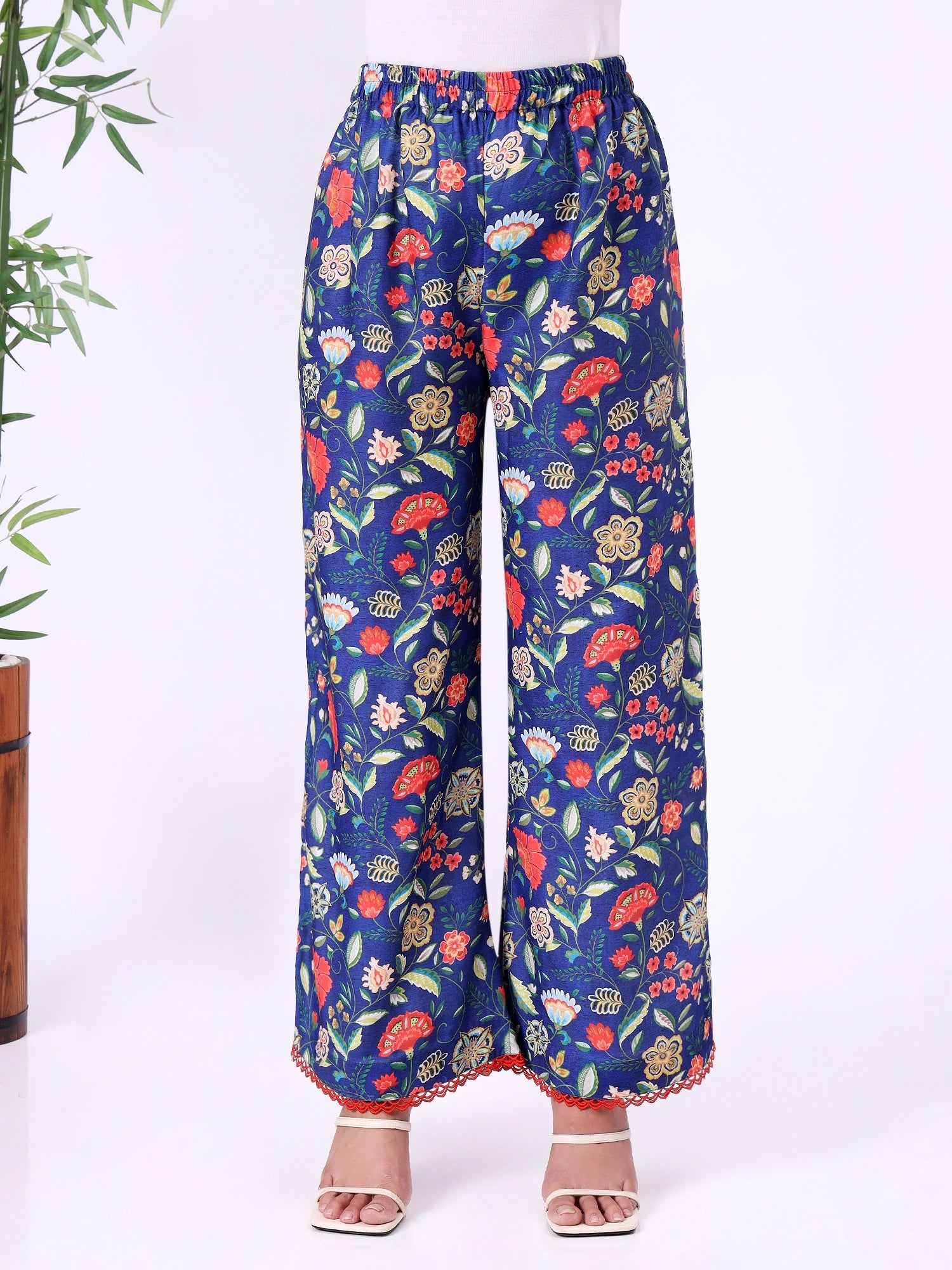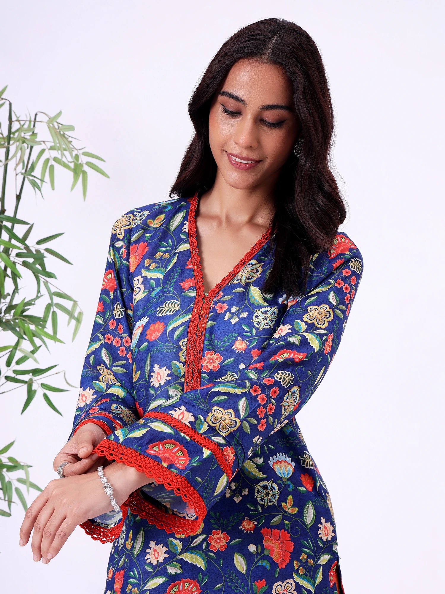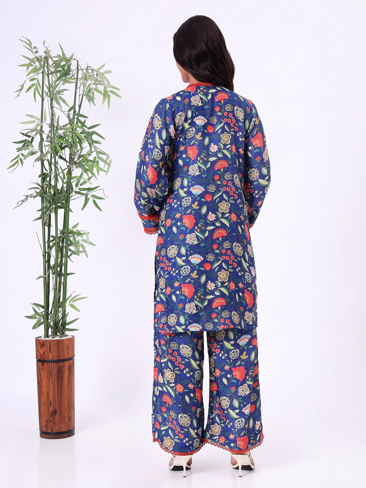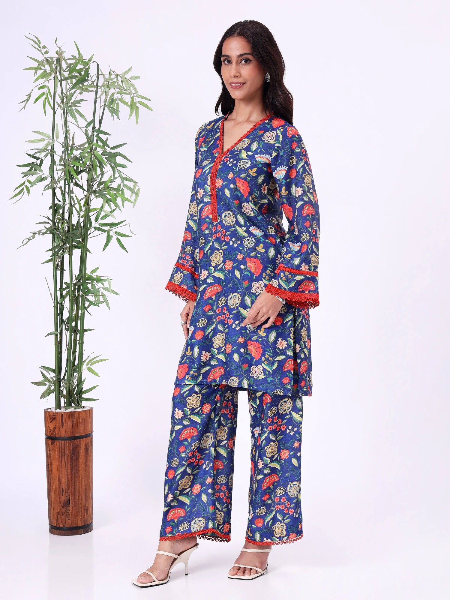 Blue floral straight kurta with V-neckline and contrast detailing. Paired with matching pants, suitable for casual wear, long days out, or comfortable festive occasions.