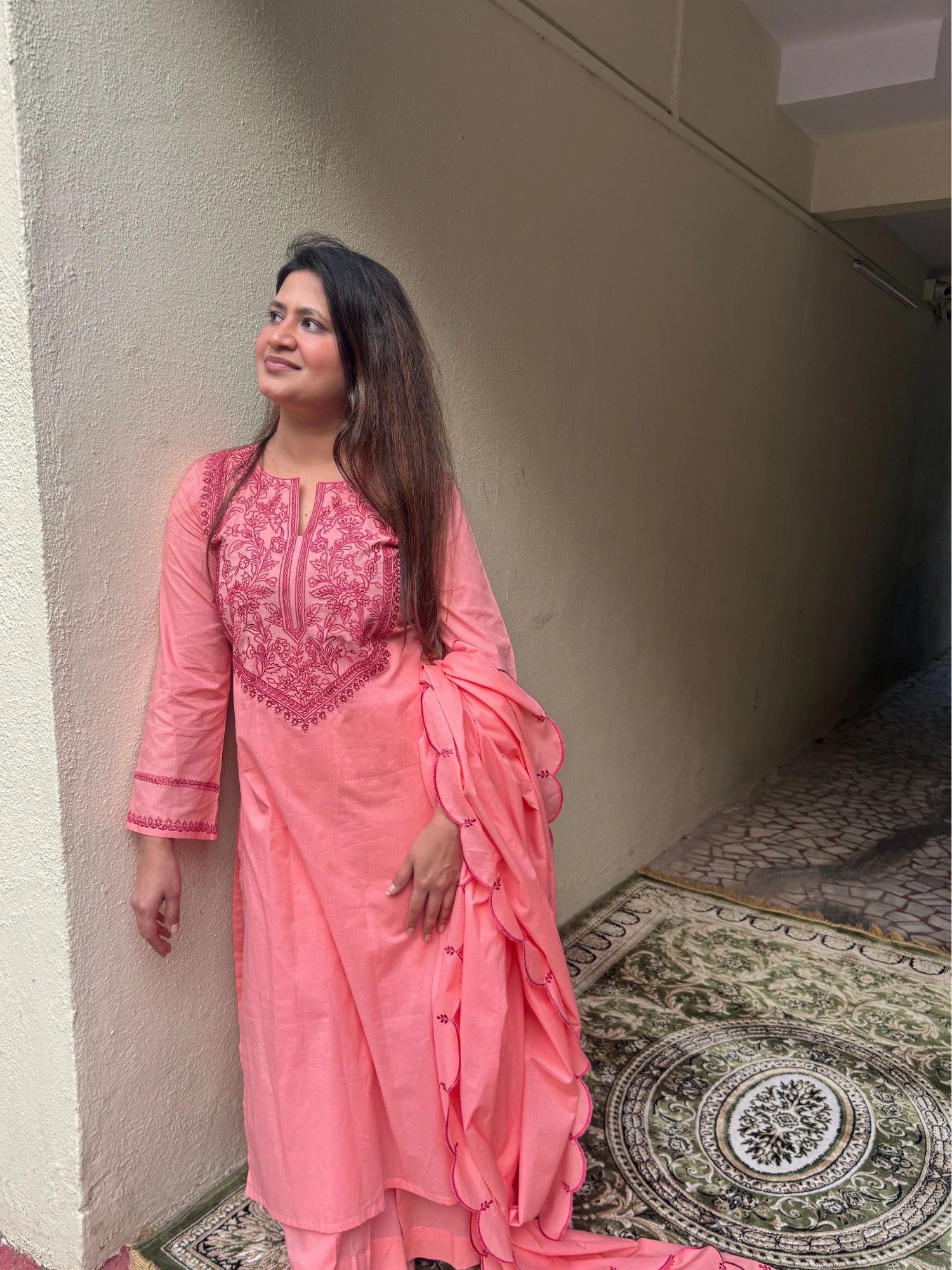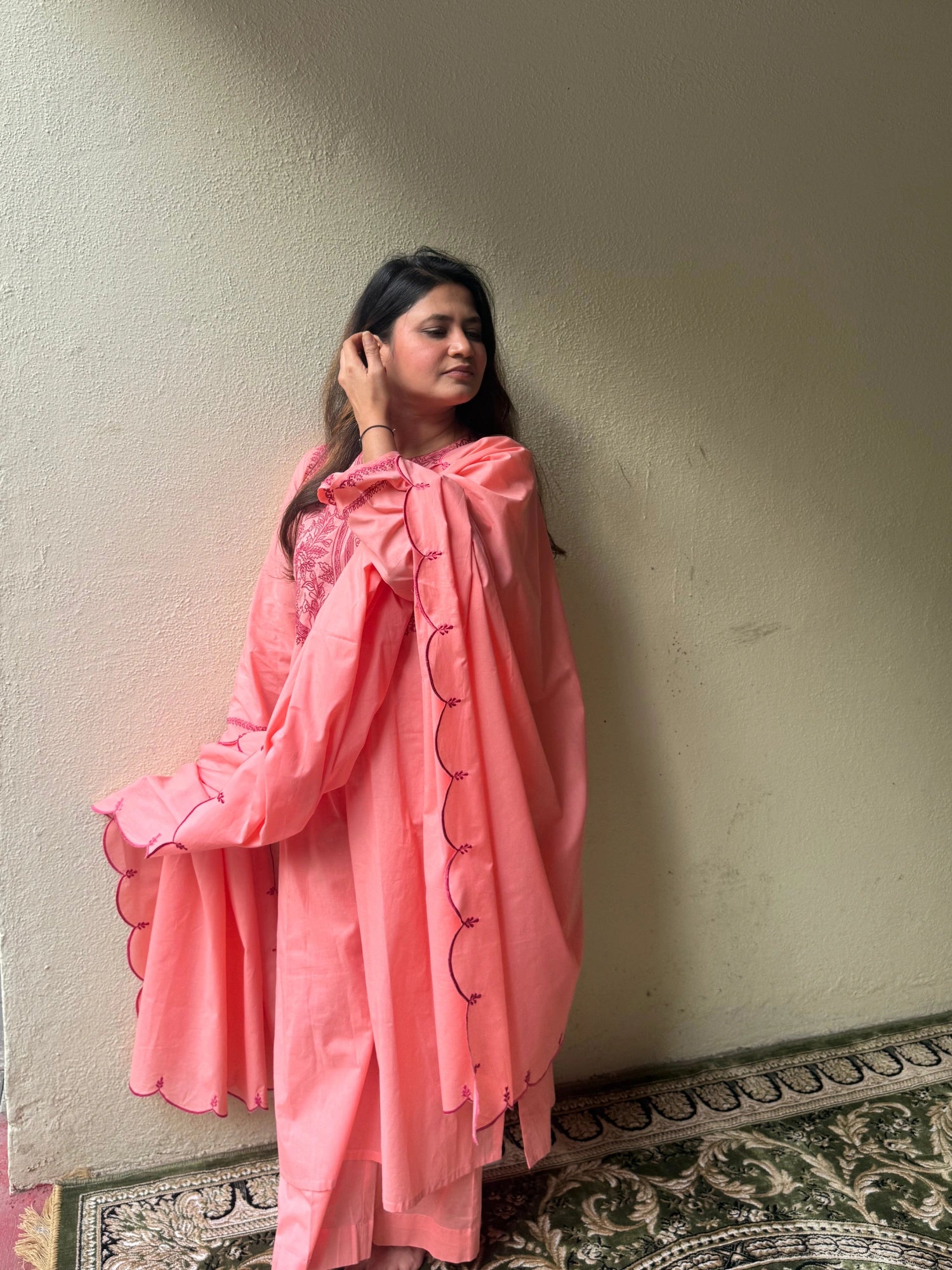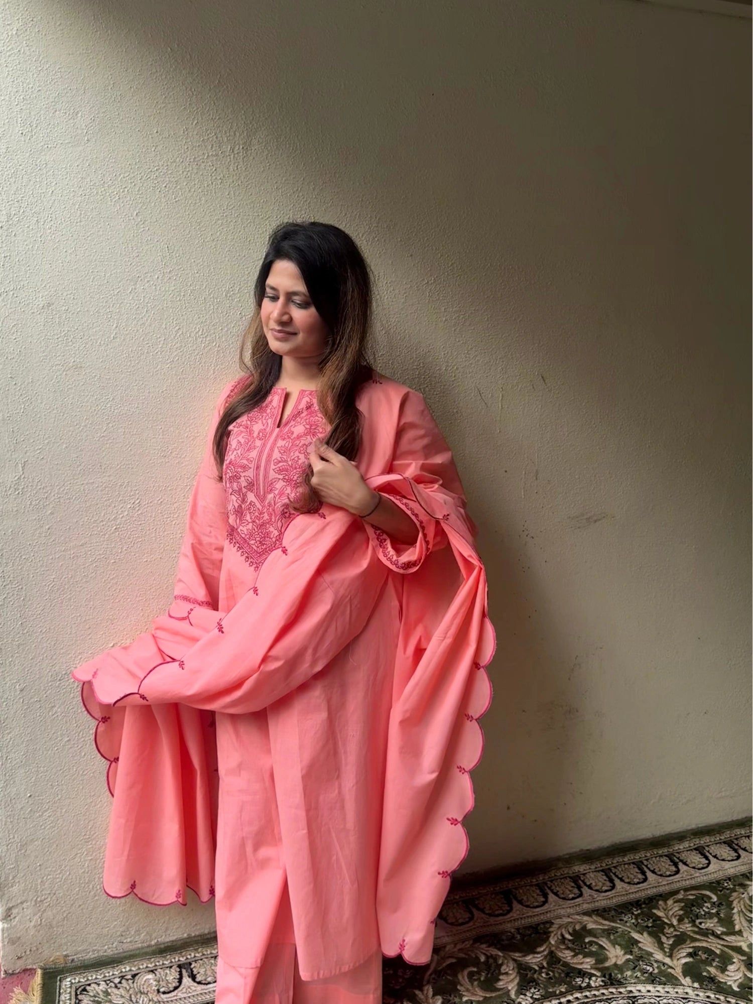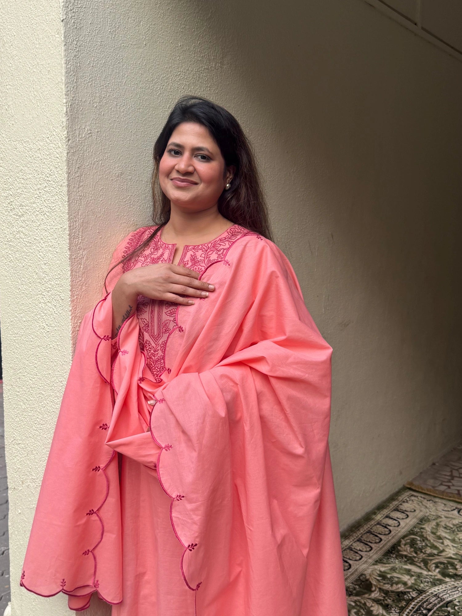 Soft coral kurta set with delicate embroidery and a matching dupatta. Comfortable to wear and easy to style for festive days, family gatherings, and daytime celebrations.