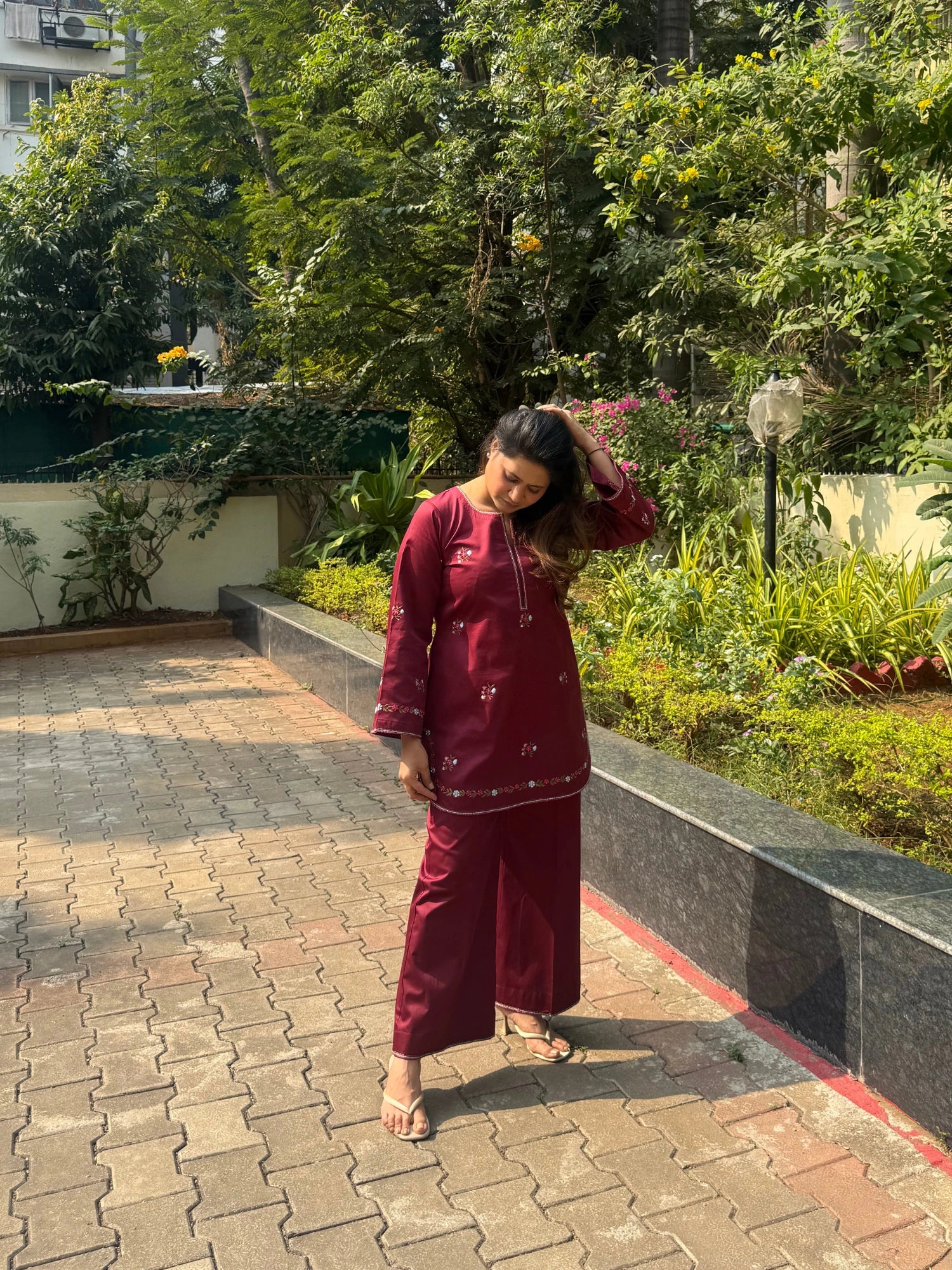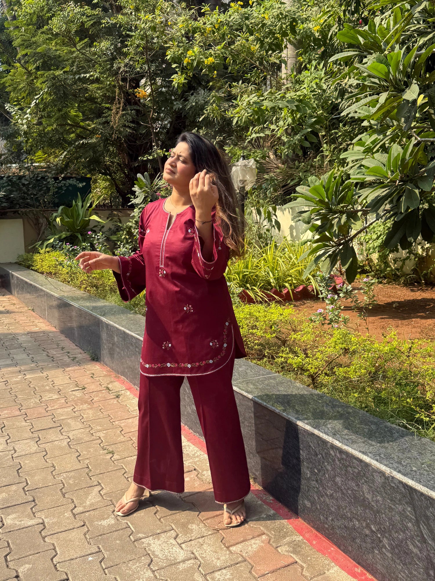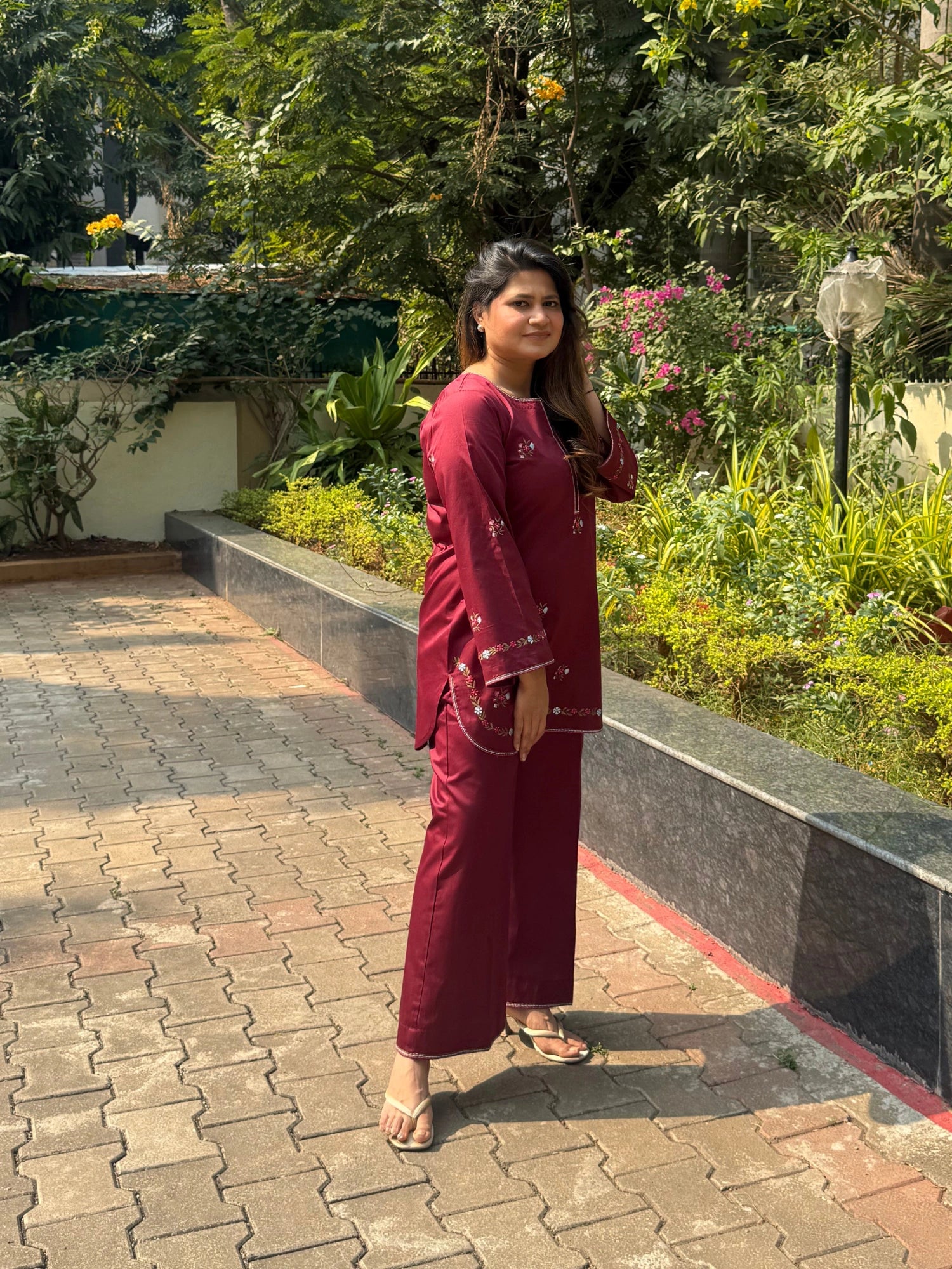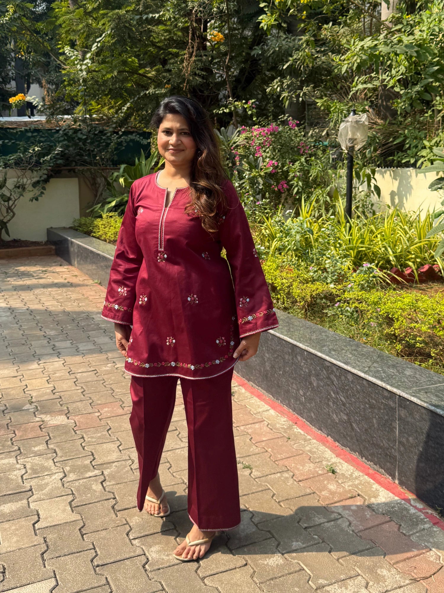 This dark maroon kurta set is crafted in a soft, breathable fabric with delicate floral embroidery, offering a relaxed silhouette designed for everyday comfort, effortless elegance, and easy wear.