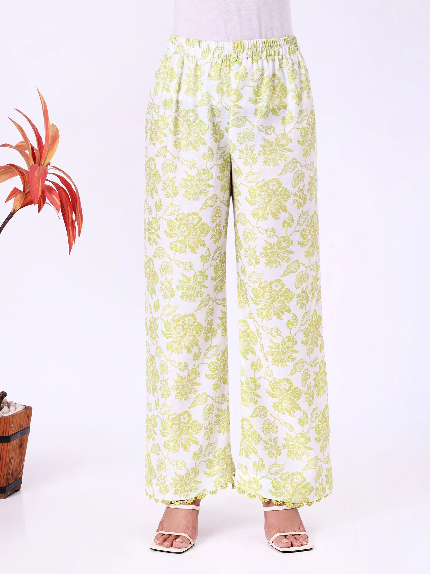Lime green straight kurta with all-over floral print and lace detailing on neckline and sleeves. Paired with relaxed-fit pants, ideal for daytime gatherings, casual celebrations, or everyday wear.
