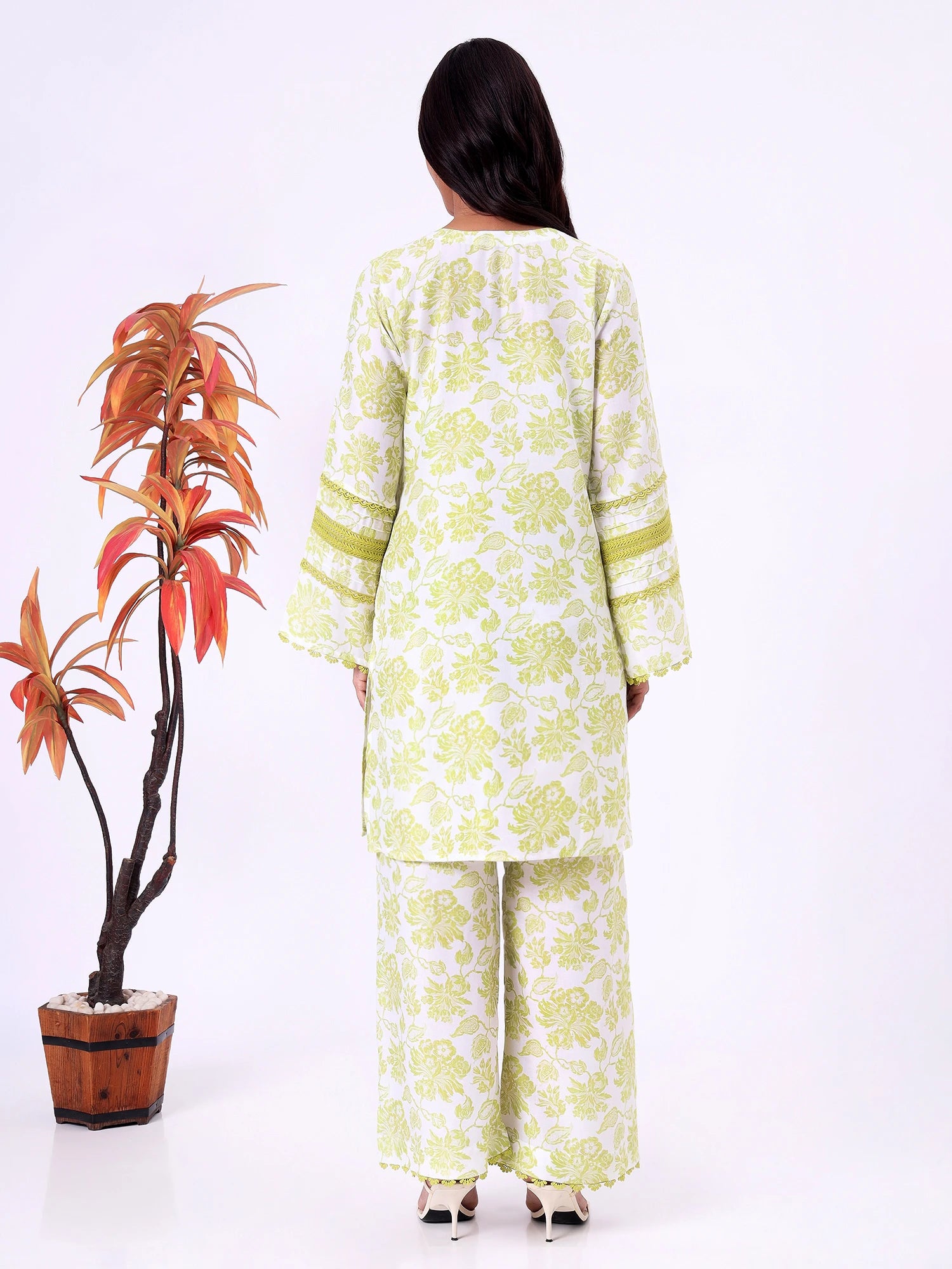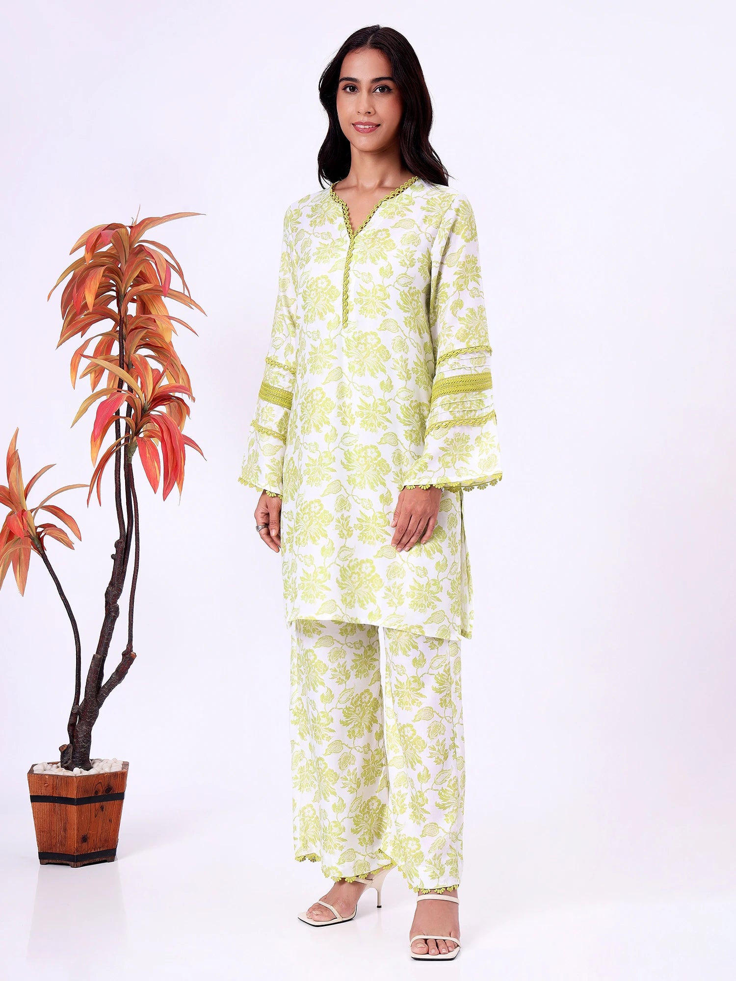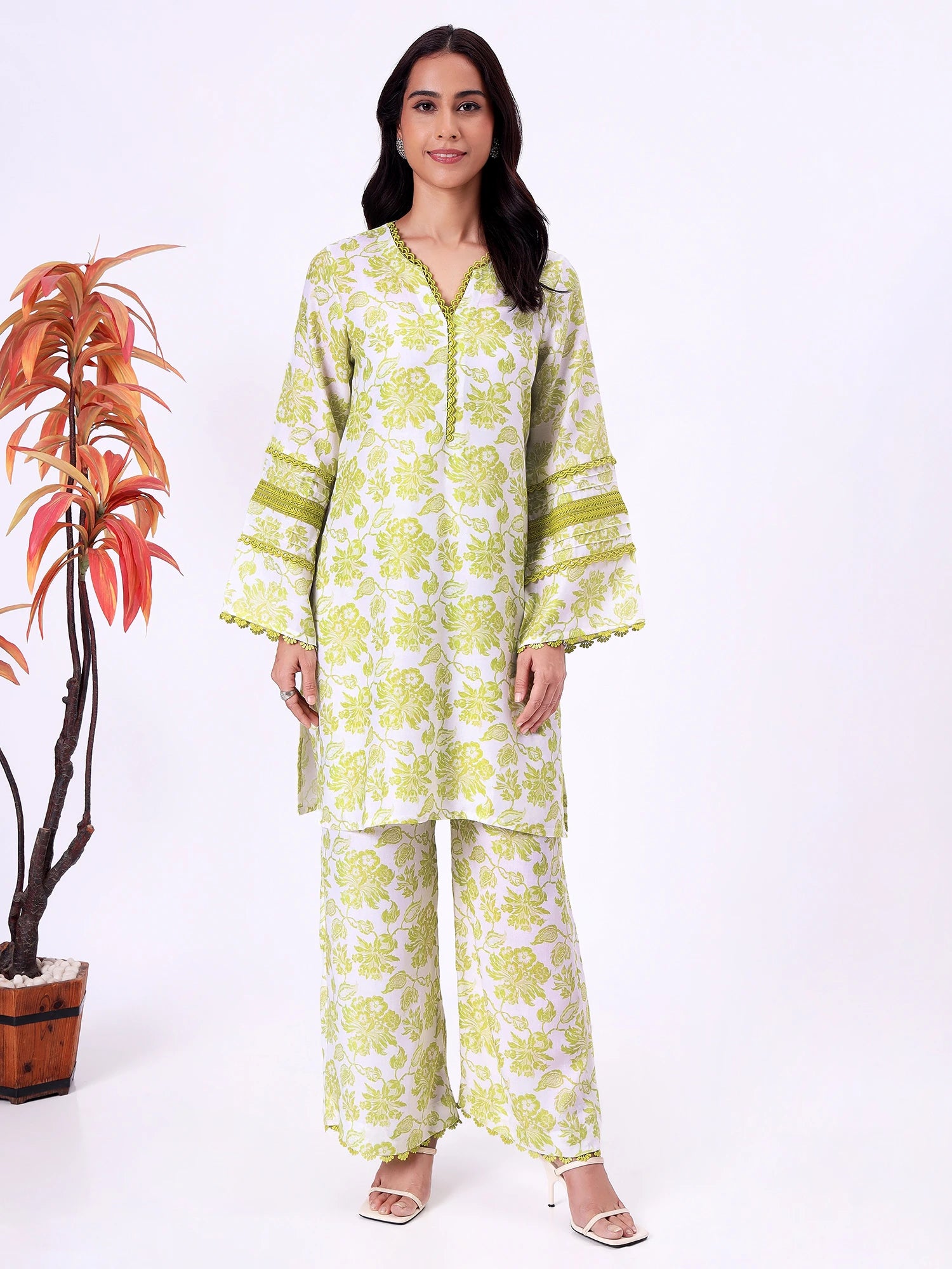 Lime Green Floral Printed Kurta Set with Lace Detailing