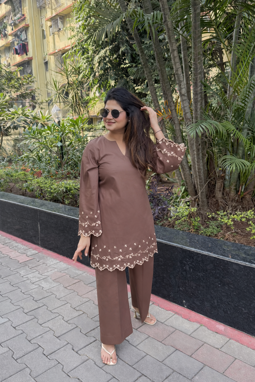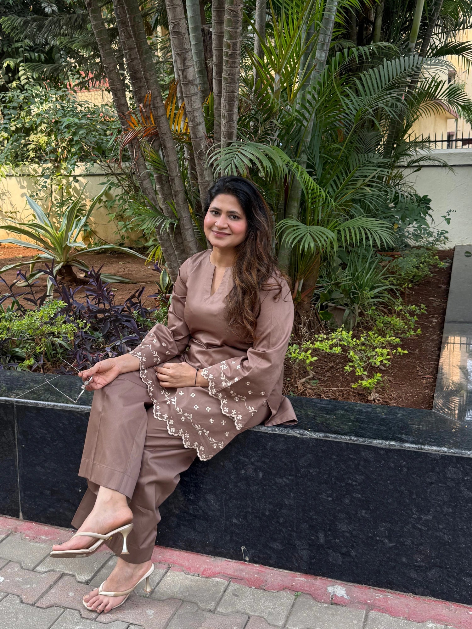 A mocha-toned kurta set finished with delicate machine embroidery along the sleeves and hem, designed in a relaxed silhouette that feels breathable, refined, and effortlessly polished for everyday wear.