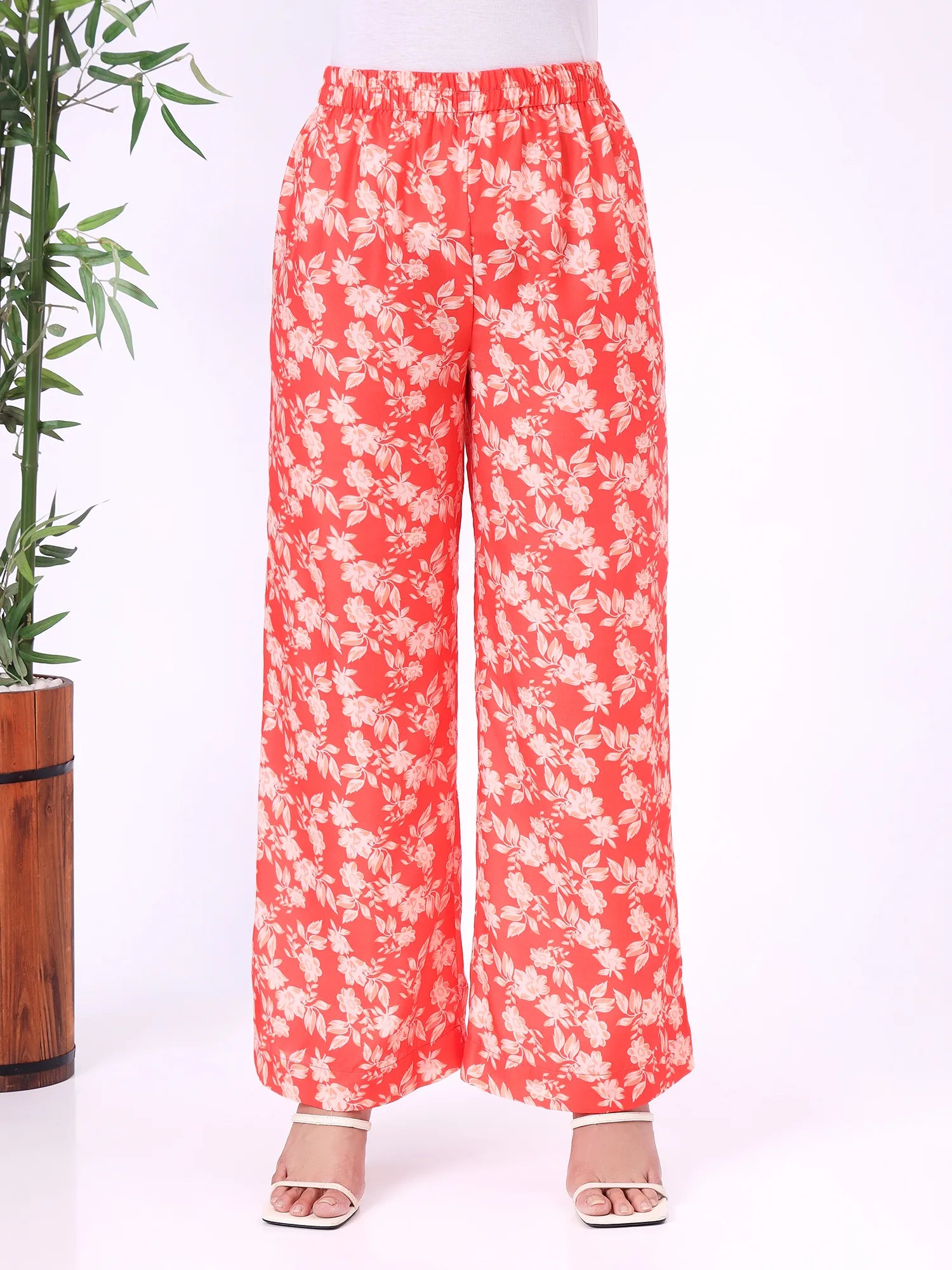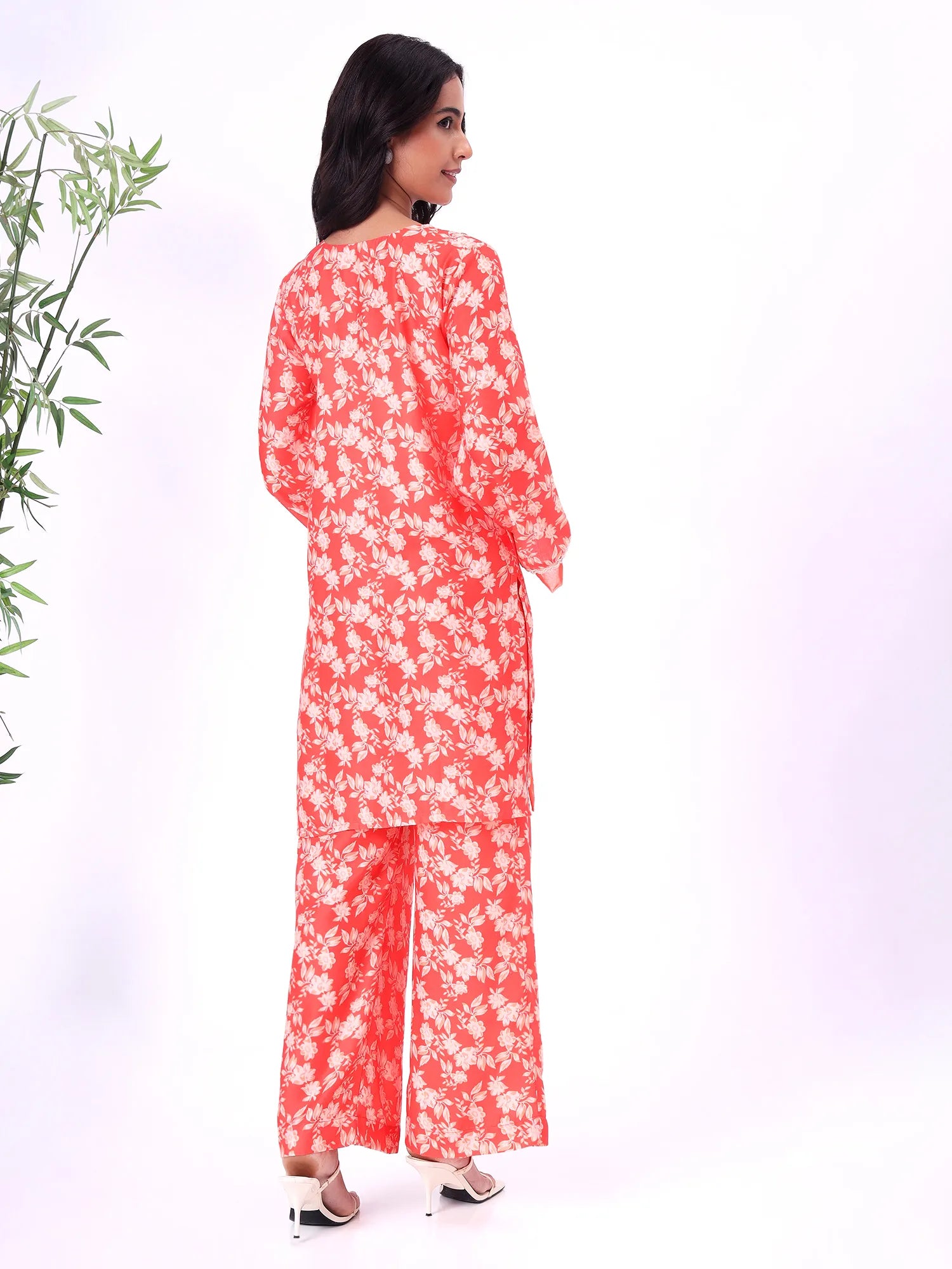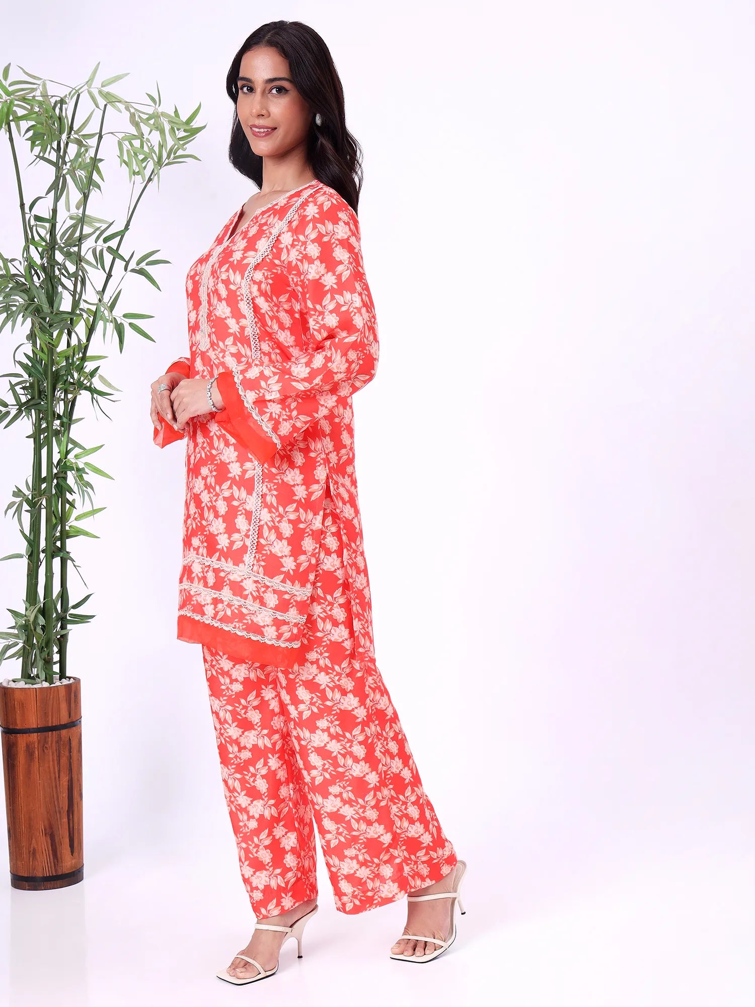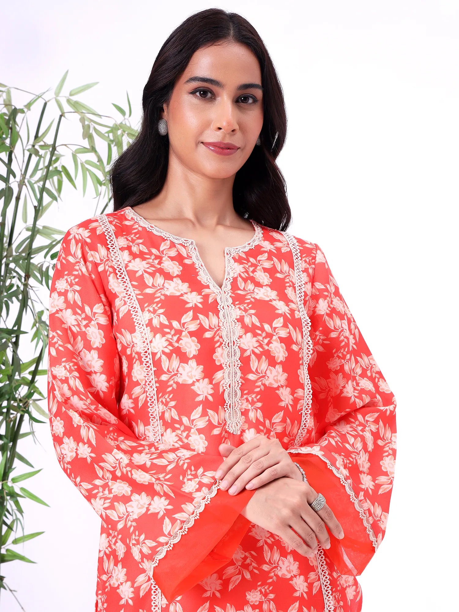 A vibrant orange kurta set with all-over floral print and delicate lace on the neckline, panels, sleeves, and hem. Paired with relaxed-fit pants, ideal for daytime gatherings, casual festivities, or daily wear.