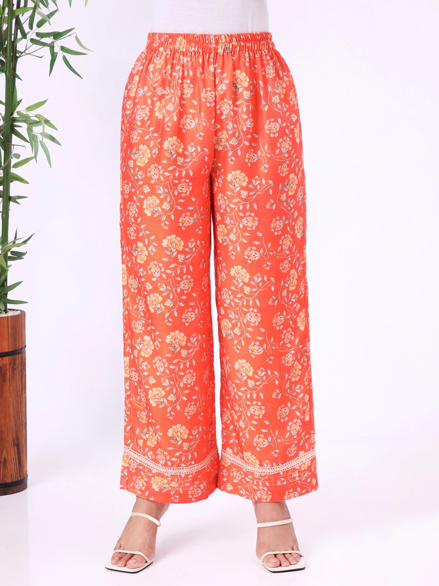 Orange kurta with floral motifs, V-neckline, and lace detailing. Paired with straight-fit pants, perfect for warm days, casual outings, or simple festive occasions.