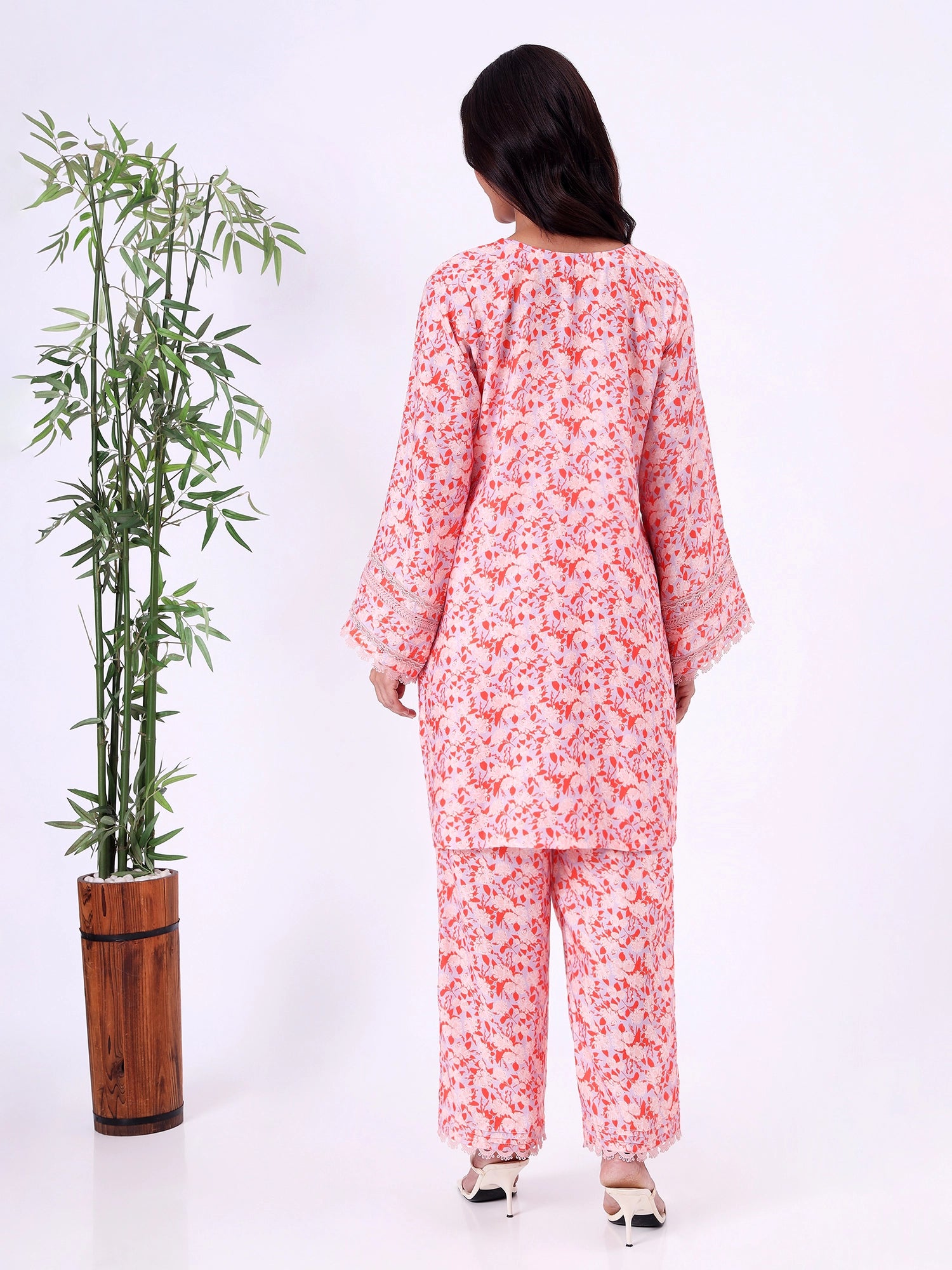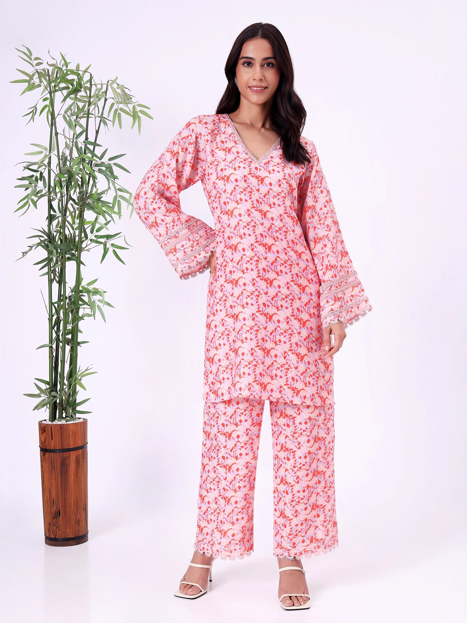 Peach Orange Floral Printed V-Neck Kurta Set with Lace Sleeve Detailing