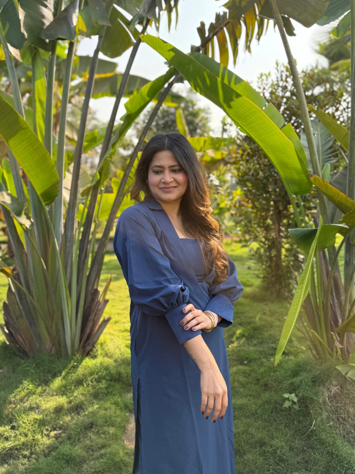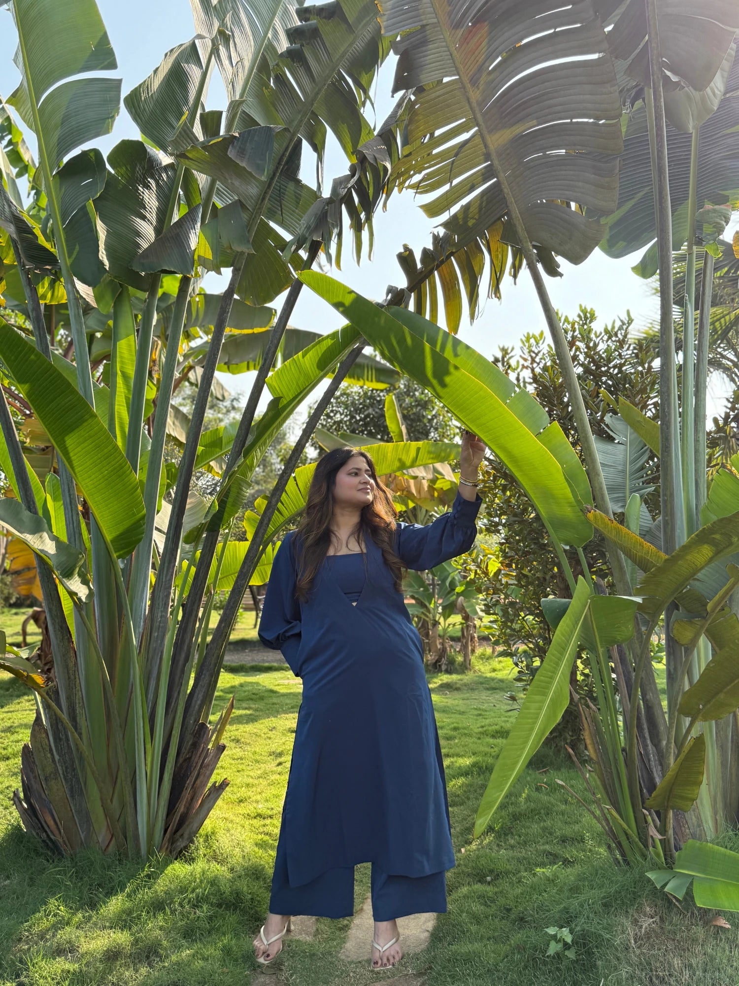 Teal blue kurta and straight pants in soft striped fabric. Minimal detailing, relaxed silhouette, suitable for casual outings, travel, or everyday wear.